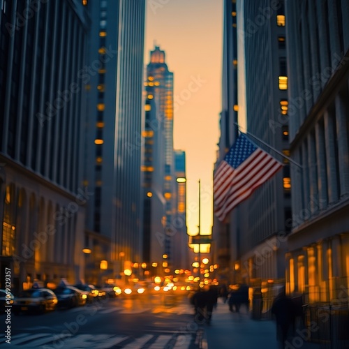 Blurred cityscape at dusk with an American flag waving in the foreground.