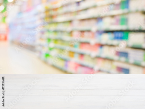 Blurred colorful supermarket products on shelves