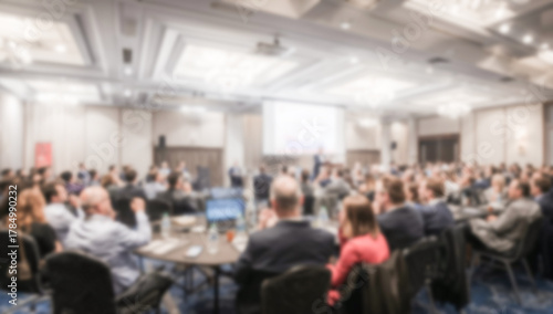 Blurred Conference Scene with Attendees and Presentations