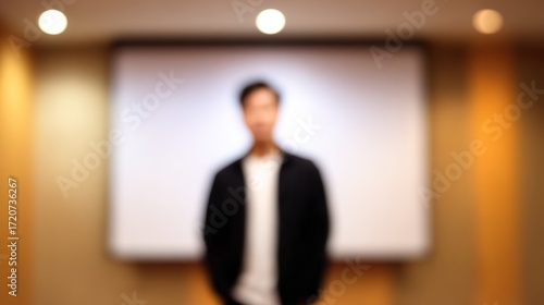 Blurred Figure Standing in Front of Projector Screen in Office Space