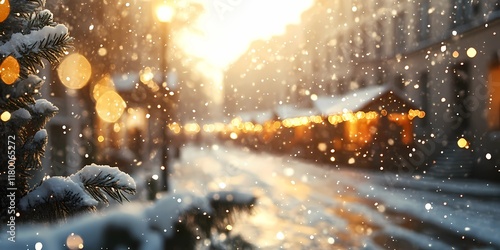 Blurred golden city lights glowing faintly on snowy streets, creating a serene and abstract winter urban background, style book illustration