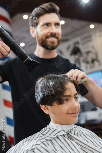 Blurred hairstylist drying hair of teenage boy in cape in beauty salon.
