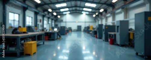 Blurred industrial factory workshop with machinery and equipment in background, production, interior