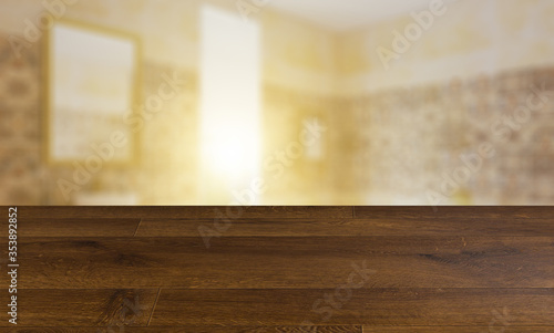 blurred interior on a wooden table background.Spacious bathroom in gray tones with heated floors, freestanding tub. 3D rendering.. Sunset