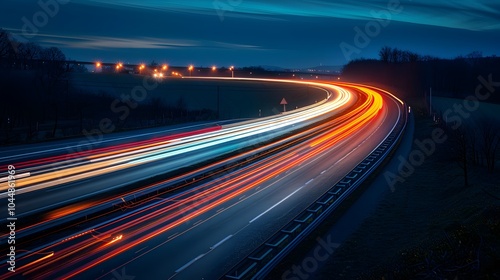 highway, expressway, road, night, traffic, speed, motion, luminance, illumination, transportation, driving, travel, journey, car, vehicle, headlamp, rear lamp, blur, long exposure, dusk, evening, dark, sky, landscape, scenic, curve, winding, countryside, rural, nature, environment, energy, technology, modern, network, infrastructure, commute, path