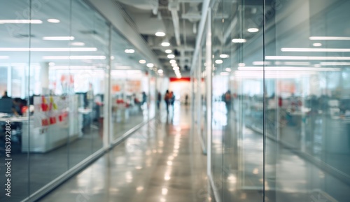 Blurred modern office hallway with glass walls and bright lights