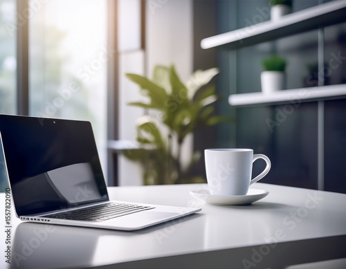 blurred modern office interior with a laptop and coffee cup on a white table in a minimalist style