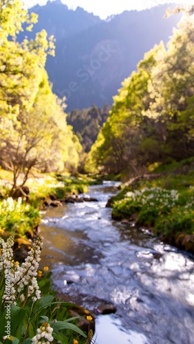 stream, mountain, tree, flower, water, vale, sunlight, nature, flowing, tranquil, green, lush, vibrant, blurred, scenic, landscape, outdoors, peaceful, spring, rocky, whitish, springtime, forested, bright, gentle, wild, beauty, fresh