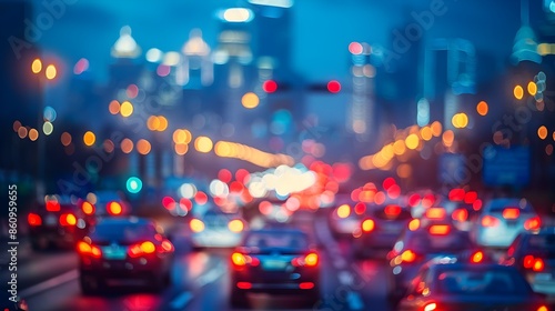 Blurred Night City Skyline with Traffic Jam in Foreground