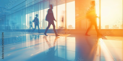 Blurred photograph of people walking in a modern office building hallway, showcasing light beige and gray architecture with a dynamic motion effect, creating a sense of activity and movement