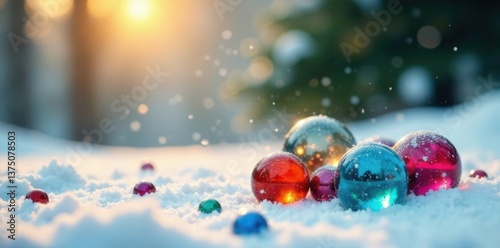 Blurred shine of colorful glass balls on a snowy white background with a large green tree , baubles, evergreen