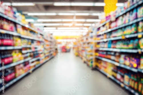 supermarket, aisle, blurred, grocery, shelf, product, drink, food, colourful, interior, shopping, store, retail, aisle, bright, light, client, cart, cardboard box, food, vegetable, fruit, spice, canned, bottled, packed, display, retailer, consumer, modern, background, lighting, shop