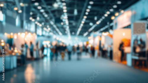 Blurred Trade fair show background, exhibition with booths for business, companies and industry to showcase and demonstrate products and services, for people, partners and customers