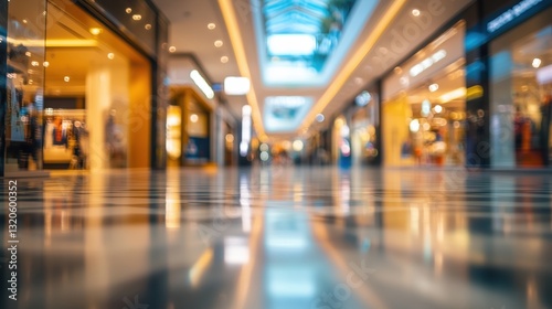 Blurred view captures the elegance of modern shopping mall interiors with upscale stores in soft lighting