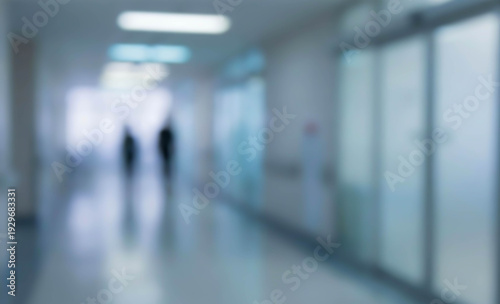 Blurred view of a corridor in a medical facility, featuring soft lighting, glass doors, and indistinct figures walking. The setting indicates a hospital environment.