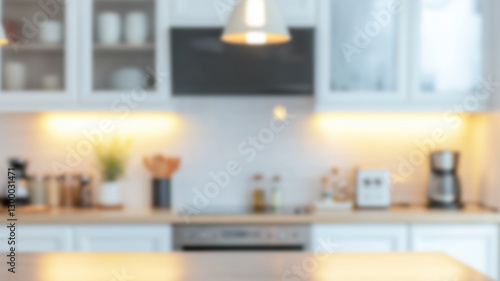 Blurred view of modern kitchen with white furniture. AI Generated Images