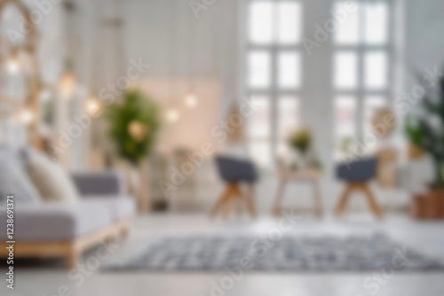 Blurred view of modern living room with sofa and soft bench. room interior with couch, armchair and coffee table or shelving units. stylish living room. comfortable workplace near big window.