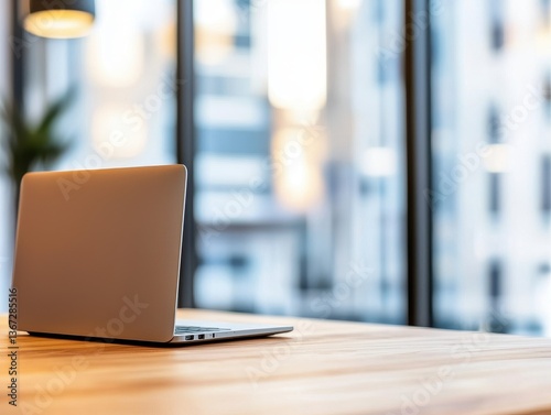 blurry background office workspace lighting concept. Laptop on a wooden table with urban view through large windows.