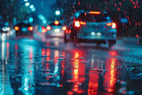 Blurry car taillights on wet road at night, raindrops on camera lens effect, cinematic rainy mood.