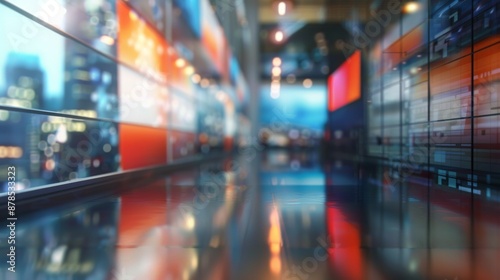 Blurry city lights reflect off the sleek floor of a bustling newsroom