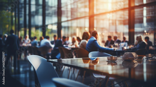 Blurry photo of a big modern corporate office with business people
