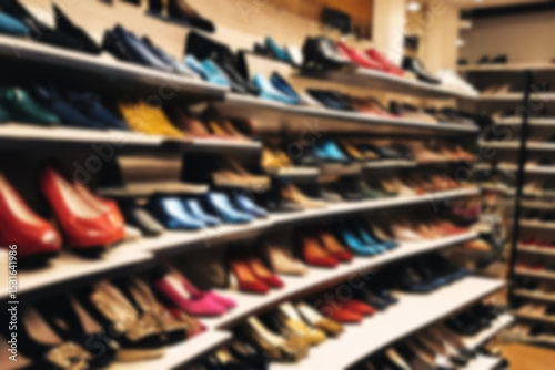 blurry photo of a shoe store, lots of women's shoes neatly lined up on the store shelves