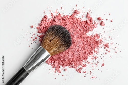 make-up, reddening, brush, powder, cosmetic, beauty, pink, colours, white, surface, tool, applicator, bristle, handle, elegance, glamour, facial, face, skin, complexion, healthy, tone, feminine, fashion, style, decorative, art, background, still, life, closeup, detail, clean, soft, smooth, texture, pigment, scatter, isolated, nobody, studio, bright, composition, minimal, simple