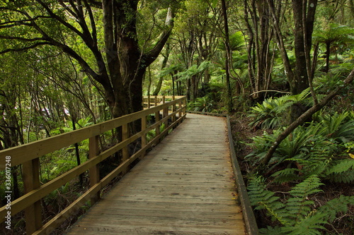 summer, nature, forest, tree, fern, plant, moss, lichen, leaf, foliage, railing, boardwalk, paseo, footpath, south island, new zealand