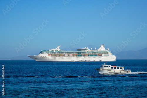 Boat and cruise liner is Aegean sea. Chora, Mykonos island, Greece