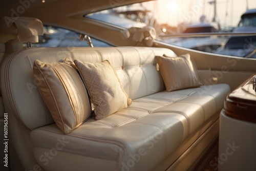 Boat Furniture. Luxury Yacht Interior with Leather White and Beige Seats