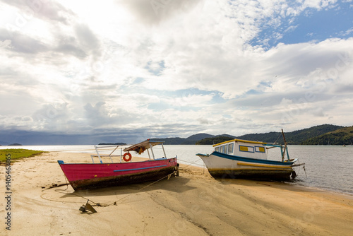Boat on the beach in Paraty Bay, Rio de Janeiro, Brazil, where passenger boats for tourists to be taken to nearby islands or other villages.