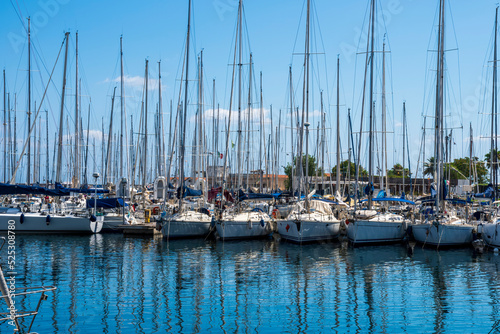 boats and yachts on pier in marine city port with masts and bulidings and blue sky on background