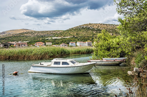 Boats with reflections in the beach bay, Pantan, Trogir, Croatia