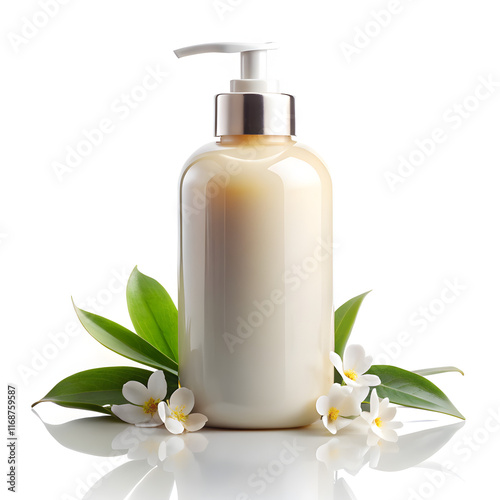 Body lotion and flowers on white background