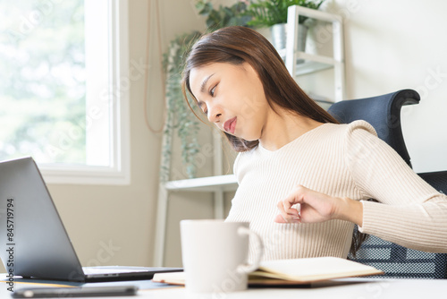 Body muscles stiff problem, ache asian young woman, girl pain back, stretch while sitting work on chair at home, holding massaging rubbing, hurt or sore, Healthcare people, office syndrome .