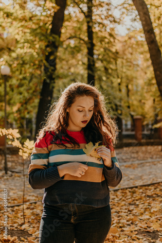 Body Shaming, Low self-worth. Body positive, diversity, Body neutrality, body positivity, resolutions self-improvement. Sad plus size woman walking in autumn park