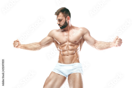 bodybuilder posing. Beautiful sporty guy male power. Fitness muscled manin white lingerie. on isolated white background.