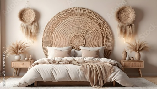 bohemian, bedchamber, interior, rattan, headboard, beige, neutral, natural, texture, minimalist, cosy, calm, serene, sleep, relaxation, comfort, home decor, chic, elegant, wooden, bed, pillow, blanket, nightstand, modern, rustic, light