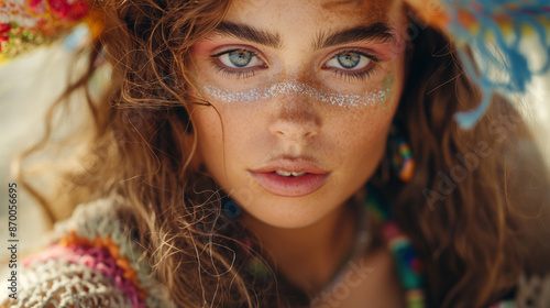 Bohemian Fashion Model with Handmade Crochet Top and Colorful Headband