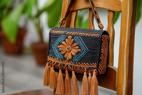 Bohemian-style woven handbag hanging on a wooden chair, with tassels and earthy tones perfect for a casual, laid-back look