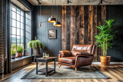 Boho minimalist living room: grunge wood paneling complements a plush leather armchair.