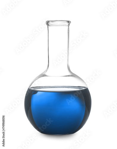 Boiling flask with blue liquid isolated on white. Laboratory glassware