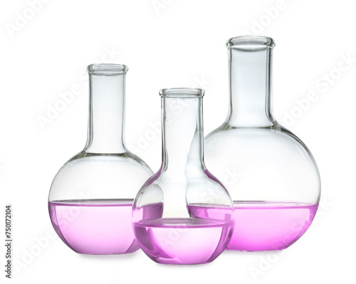 Boiling flask with pink liquid isolated on white. Laboratory glassware