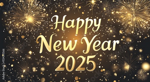 Bokeh effect with glowing fireworks and twinkling stars, highlighting the text Happy New Year 2025 in bold gold lettering