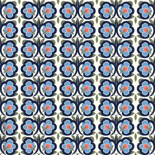 Bold Blue and Red Geometric Floral Tile Seamless Pattern