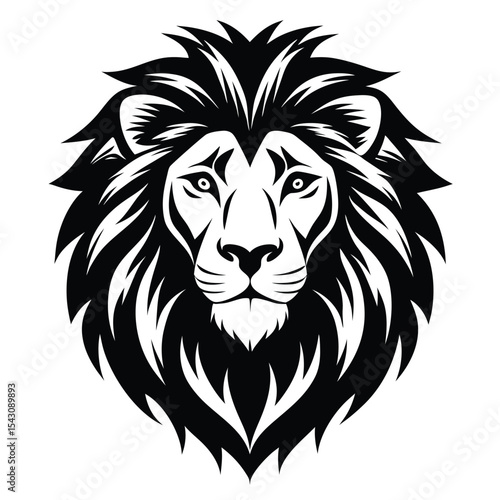 Bold, detailed lion head features a strong mane in striking black silhouette