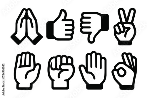 bold, hand, gesture, icon, gesture, set, silhouette, praying, hand, thumb, up, down, peace, signs, high, 5, fist, open, palm, ok