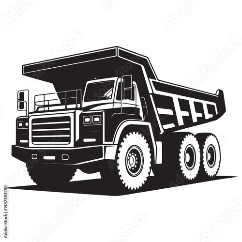 Bold monochrome illustration of a heavy duty dump truck, Vector black silhouette. with white background
