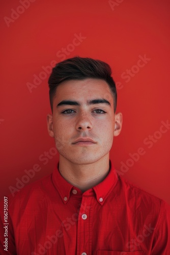 portrait, bold, young, red, man, expression, serious, high-coloured, background, intensity, drama, design, marketing, editorial, photo, monotone, gaze, powerful, striking, contrast, composition, vibrant, colours, emotion, head shot, studio, fashion, creativity, art, style, individual, character, modern, aesthetic, sharpened, mood, professional, image, photo, contemporary