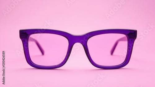 Bold square-framed glasses in glossy purple on a pastel pink background.